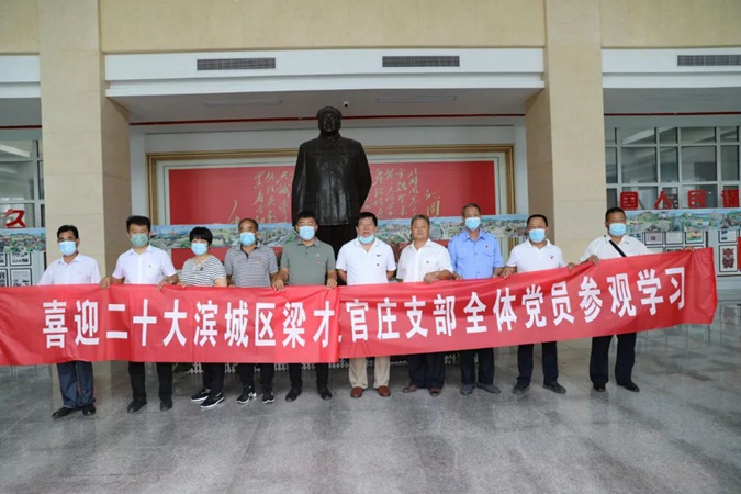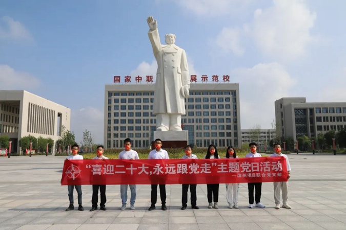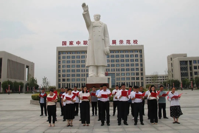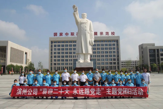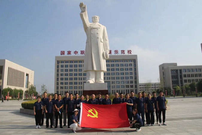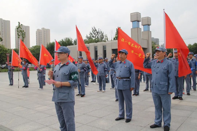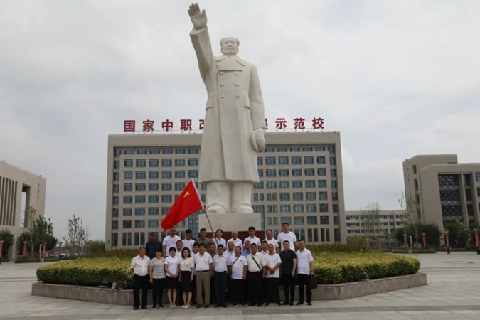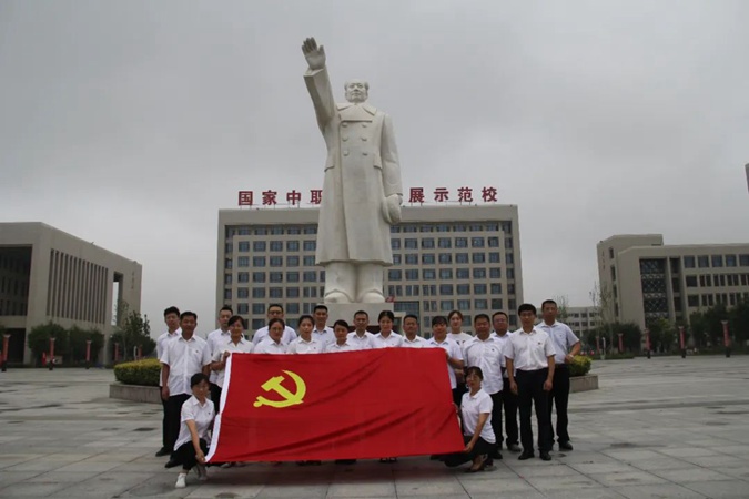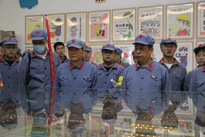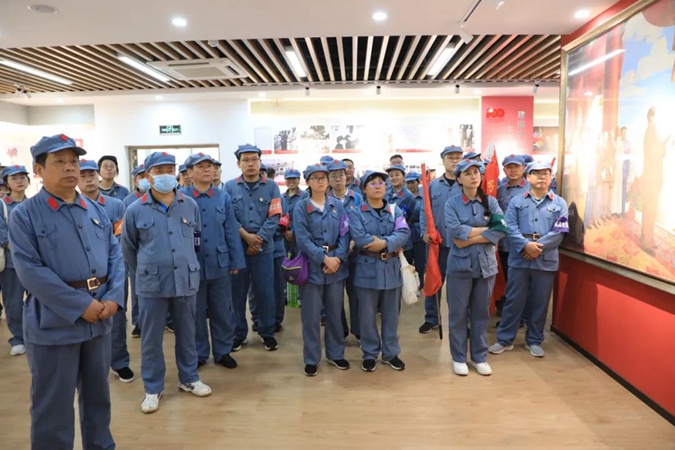 100余名党员干部人人身穿红军服,在东方红广场毛主席雕像前重温入党誓词,参观滨州市高级技工学校AAA级红色教育基地,了解革命先辈们的光荣战斗历程和英勇事迹。