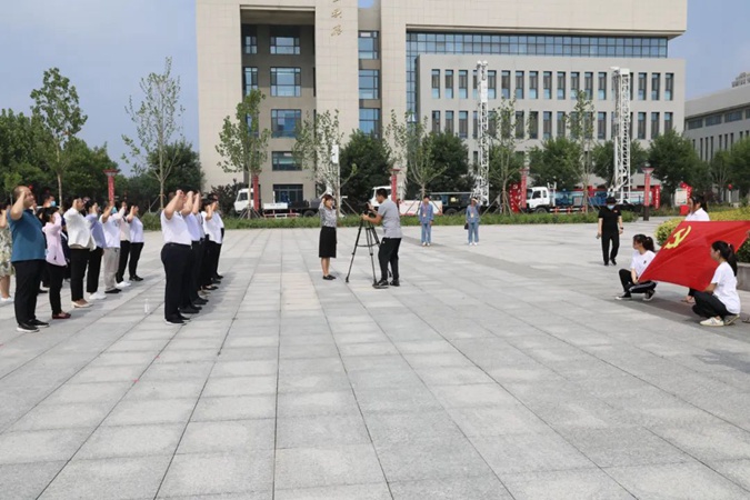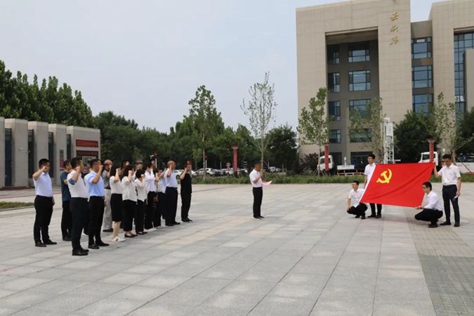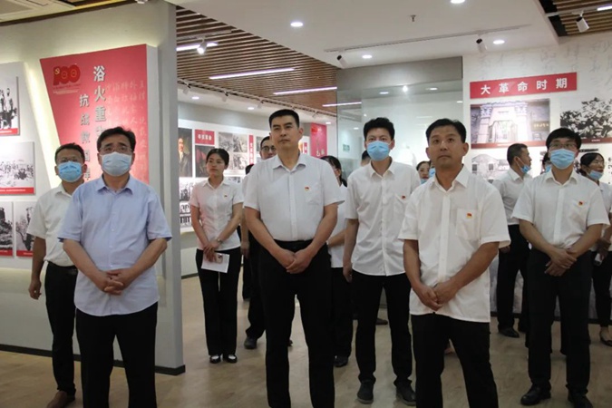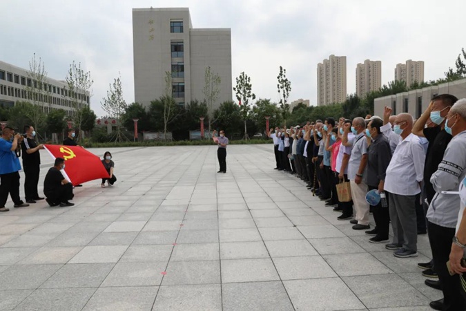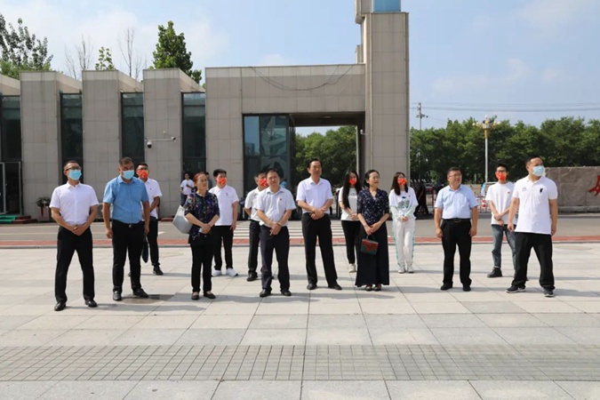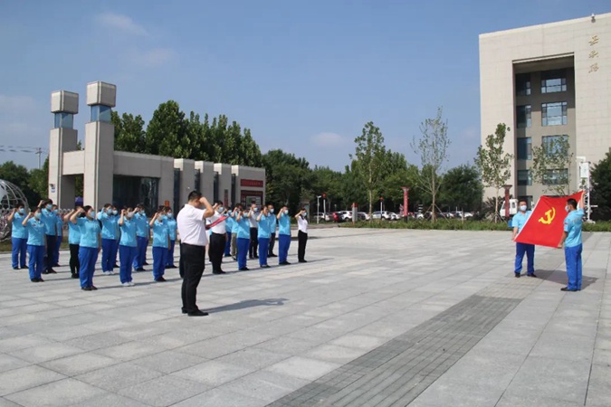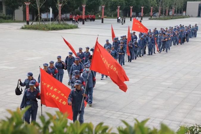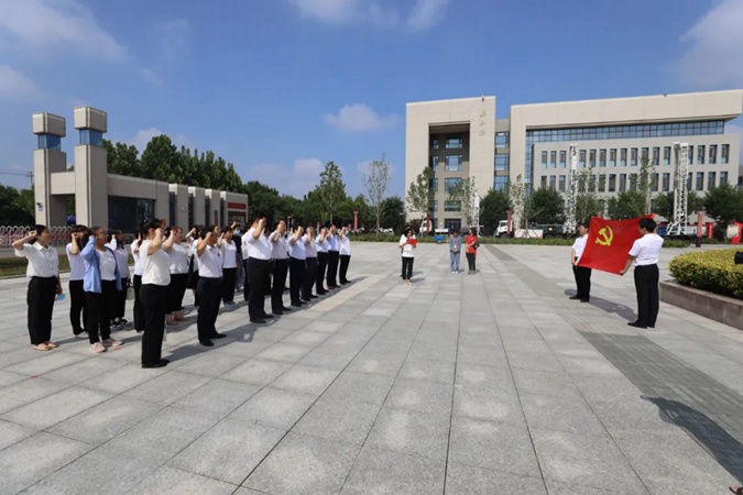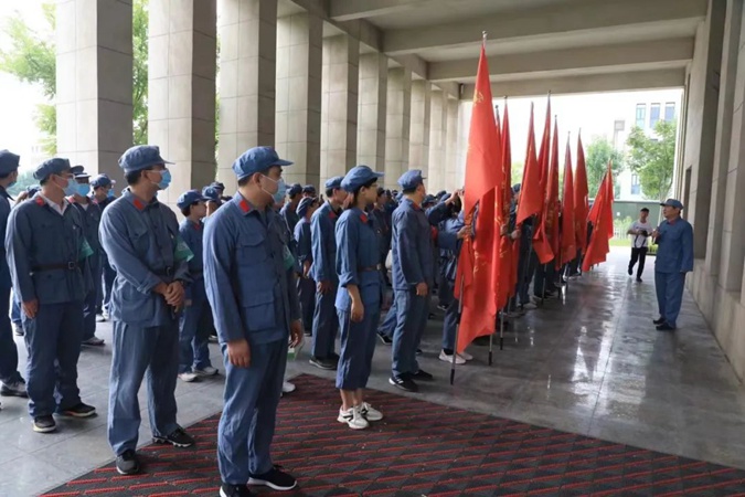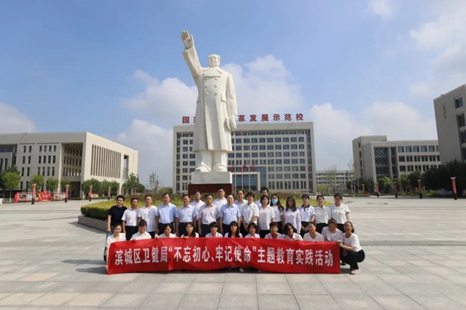 100余名党员干部人人身穿红军服,在东方红广场毛主席雕像前重温入党誓词,参观滨州市高级技工学校AAA级红色教育基地,了解革命先辈们的光荣战斗历程和英勇事迹。