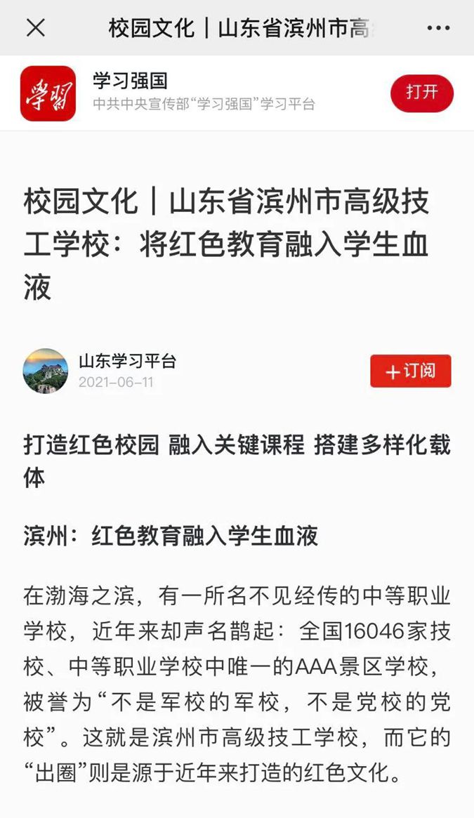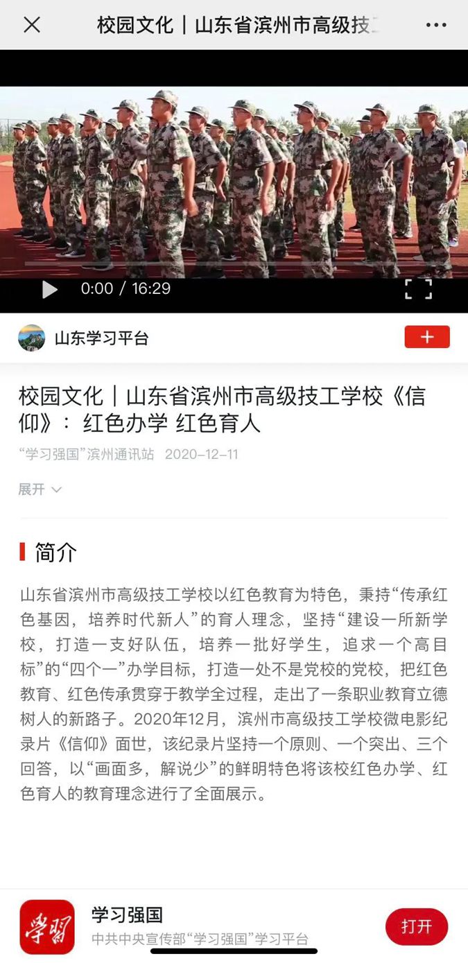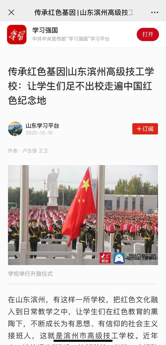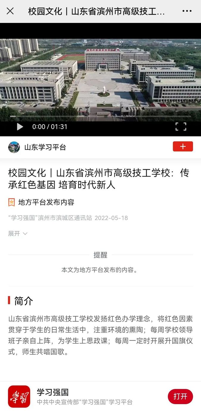 5月18日,《山东省滨州市高级技工学校:传承红色基因 培育时代新人》登上《学习强国》“校园文化”栏目,以视频形式展现学校红色环境、红色活动等。这已是滨州市高级技工学校第30次登上《学习强国》。