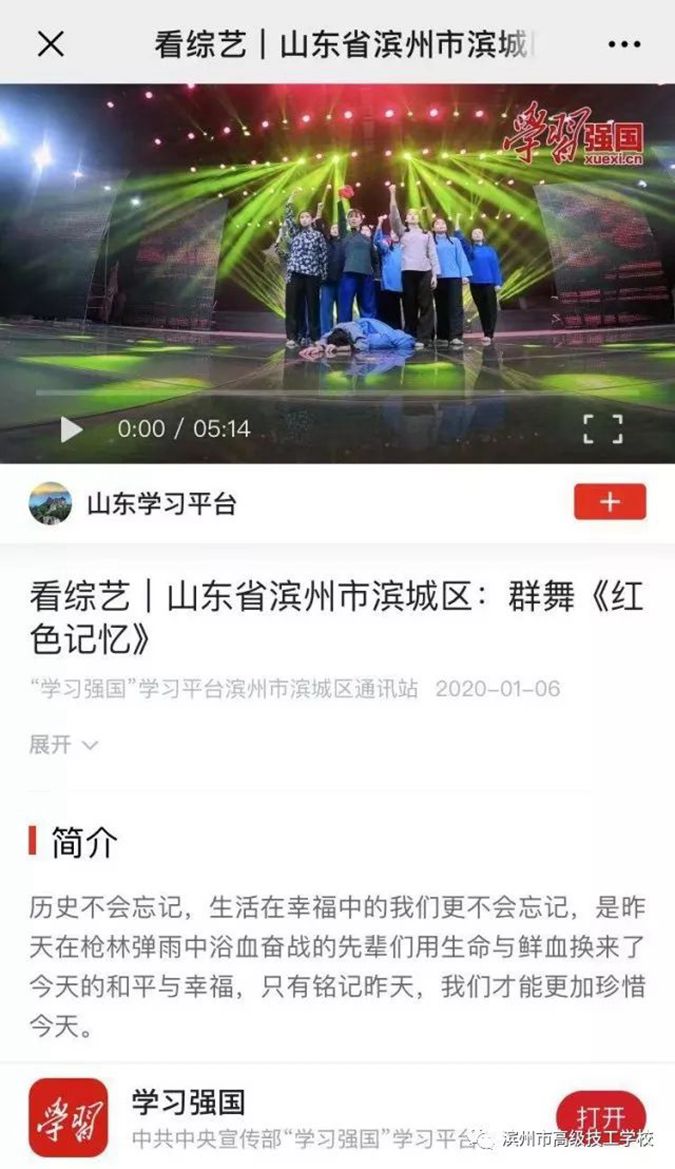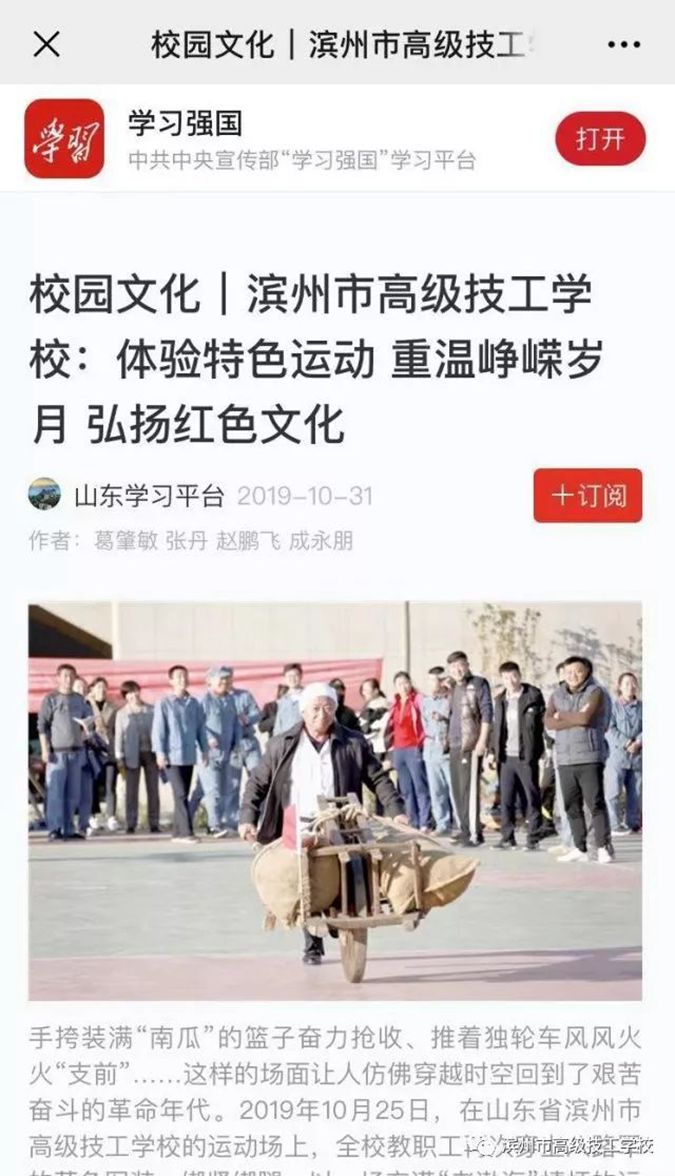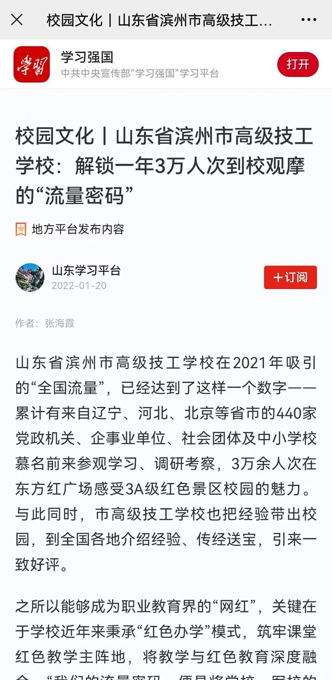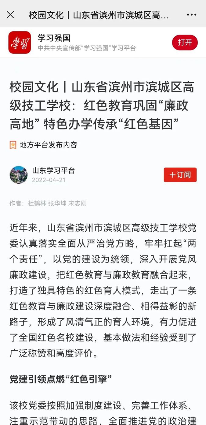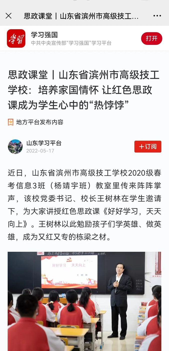 5月18日,《山东省滨州市高级技工学校:传承红色基因 培育时代新人》登上《学习强国》“校园文化”栏目,以视频形式展现学校红色环境、红色活动等。这已是滨州市高级技工学校第30次登上《学习强国》。