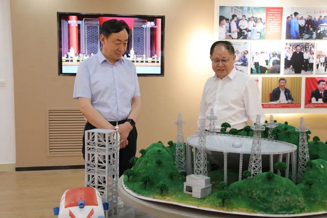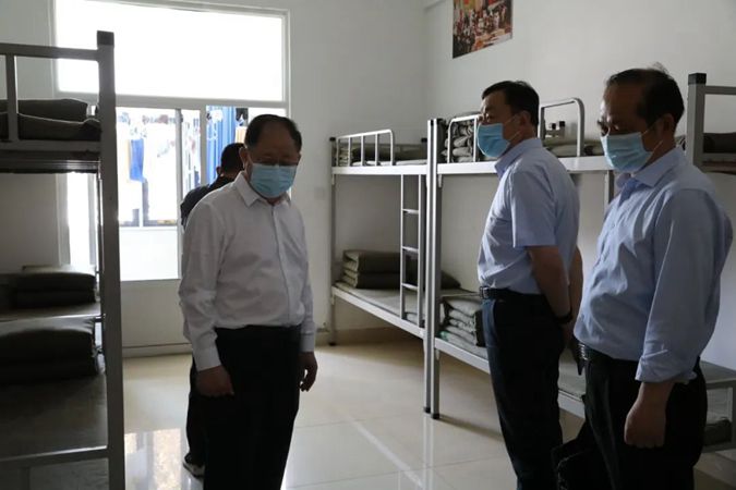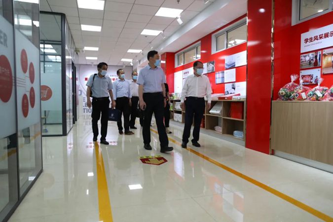 袁昊一行参观了嘉兴楼实训基地、韶山楼红色文化、井冈山楼产教工坊和京东直播实训室以及南泥湾师生劳动基地,到古田楼参观了学生公寓,到北平楼参观了红色藏品展厅、百年党史展馆等。