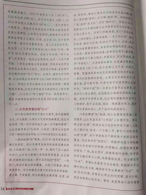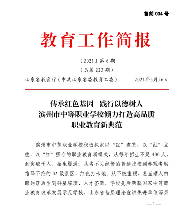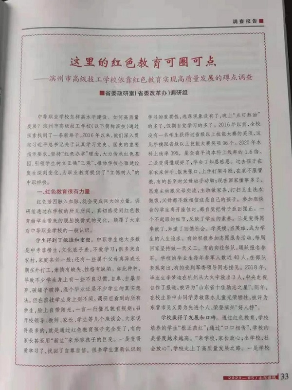 山东省委政策研究室到滨州市高级技工学校蹲点调研,向省委提交了《这里的红色教育可圈可点——滨州市高级技工学校依靠红色教育实现高质量发展的蹲点调查》,全面总结了该校红色育人、高质量发展的经验和做法,提出了进一步在全省学习、推广的建议。受到省委书记刘家义肯定签阅,省委副书记杨东奇签批“推广学习这一好典型”;市委书记佘春明签批“三好”:总结好!学习好!效果好!