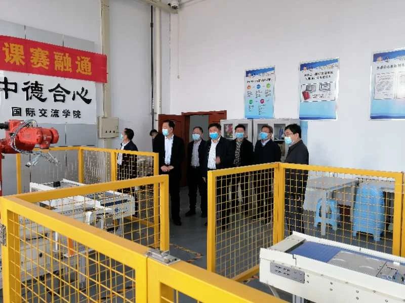 在滨州市职业学院,院长石忠陪同王树林一行参观了学院实训广场的中心控制室、工业机器人实训室、机电工程实训室和信息工程实训室,并在VR虚拟仿真实训室体验了虚拟仿真教学。