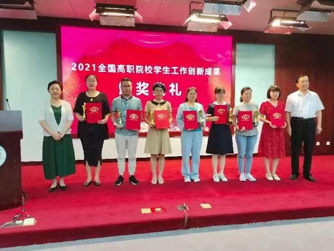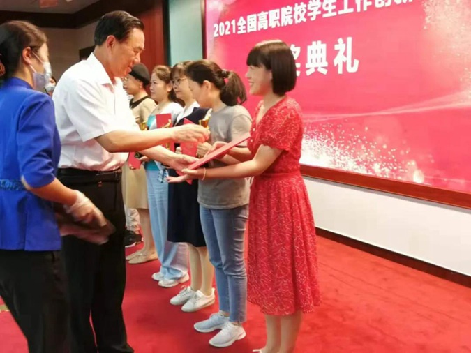 ▲王树林校长为2021全国职业院校学生工作创新成果获奖选手颁奖并合影留念