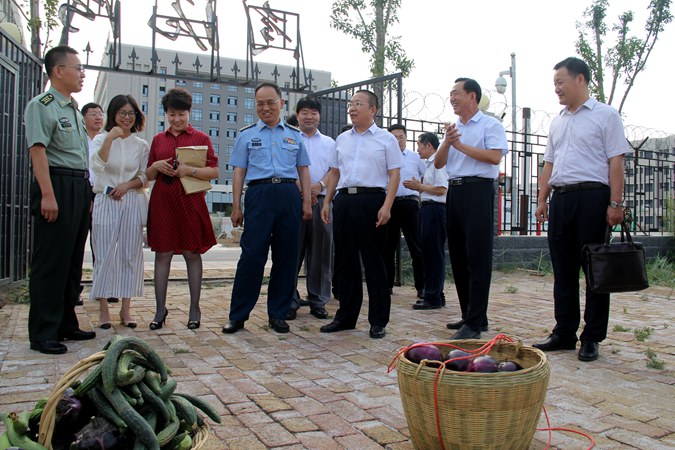 考评组成员考察了学校东方红广场,瞻仰了毛主席塑像,参观了学校习语近人展厅、老渤海精神展厅、拥军优属和拥政爱民教育展厅等6个爱国双拥教育基地,在“南泥湾”参观了师生菜园的累累硕果,并深入学生宿舍、餐厅进行了详细考察,在南昌楼参观了学校红色展馆。