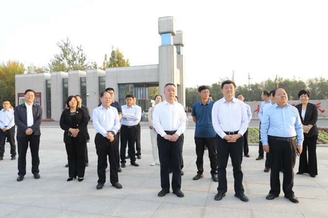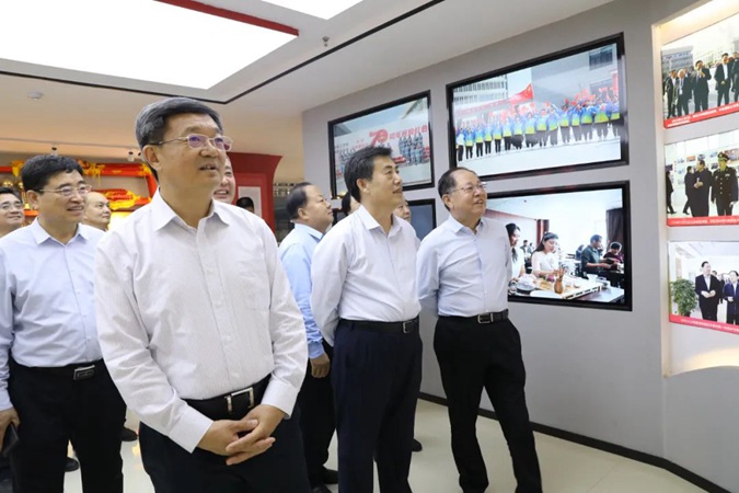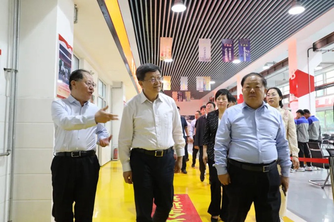 孟维赞介绍了学校基本情况及红色办学取得的显著成效,佘春明一行参观了东方红广场 、嘉兴楼实训中心;经红色连廊,到井冈山楼现场参观了校企合作项目“产教工坊”;经“南泥湾”师生劳动基地,古田楼参观了学生公寓;最后到北平楼参观了廉政文化作品展、伟人塑像厅、红色藏品展厅、红色图书馆、百年党史馆、校史馆等红色展厅。
