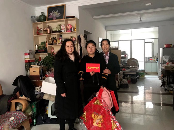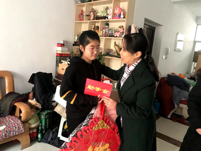 王丽静鼓励孩子克服困难,以积极的心态面对困难,自立自强,给她讲了寒假安全知识,并将500元助学金和文具、书包等学习用品交到佳怡手中。佳怡小脸上洋溢着灿烂的笑容,纯真的目光中透露出满满的幸福。