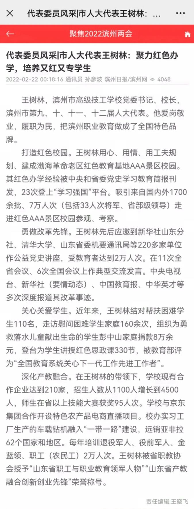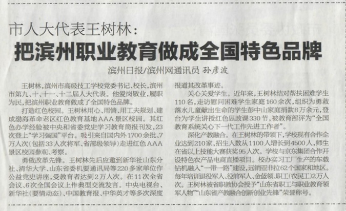 2月22日,滨州日报“聚焦滨州两会·代表委员风采录”专栏刊发《市人大代表王树林:把滨州职业教育做成全国特色品牌》