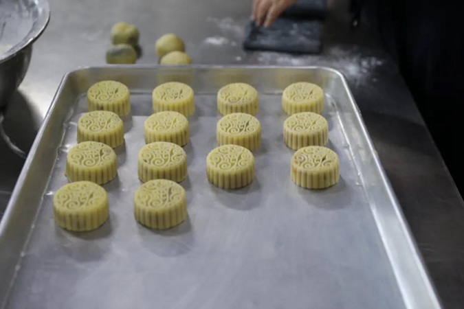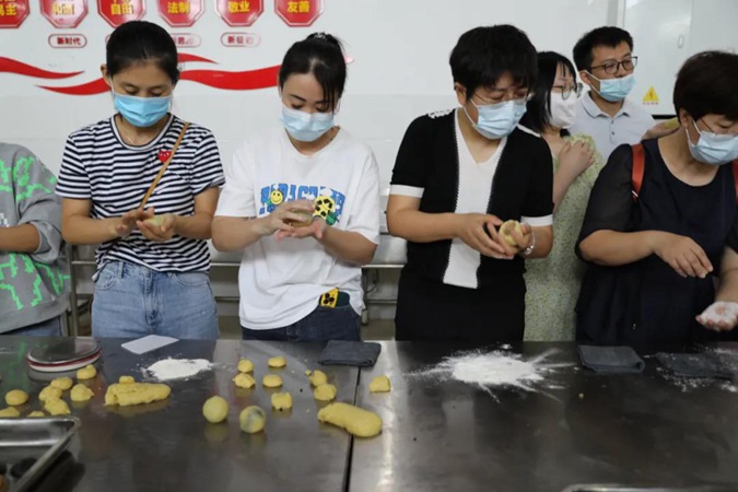 最后,参加活动人员一起来到滨州市高级技工学校西柏坡楼烹饪实训室,在面点师现场指导下,亲手制作月饼。