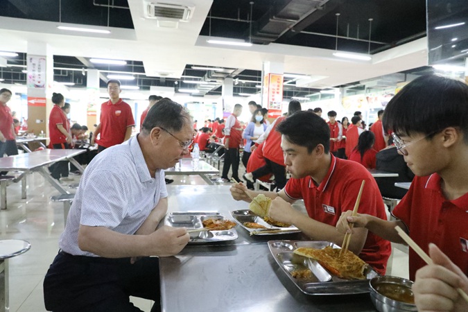 孟维赞与学生共进午餐并亲切交流,了解学生的用餐情况及对学校食堂的意见建议。