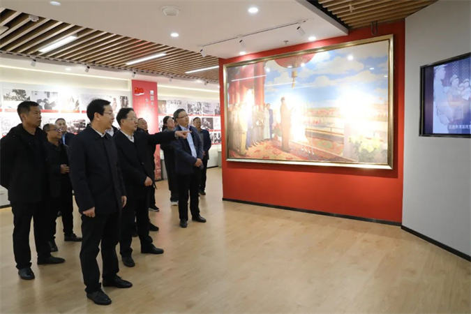 李爱国一行参观了东方红广场、嘉兴楼实训中心,到井冈山楼参观了产教融合项目数字工坊、京东电商直播实训室。经红色连廊到北平楼参观了伟人塑像厅、红色藏品展馆、将军书画厅、百年党史馆等红色展馆,最后参观了中华职教社社员之家、“e盏茶室”等教职工活动室。