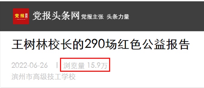 近日,中国报业协会主办的《党报头条网》转载了一篇来自山东省滨州市高级技工学校公众号的文章《王树林校长的第290场红色公益报告》。短短几天,阅读量已近16万。为什么一篇文章如此火爆?