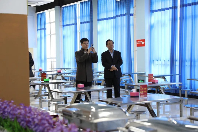 郑辉一行参观了东方红广场,在嘉兴楼了观看了学生实训,到产教工坊、京东网络直播实训室实地了解校企合作开展情况;参观了韶山楼、井冈山楼红色文化,深入教室、学生公寓、学生餐厅,了解学生学习、生活情况。