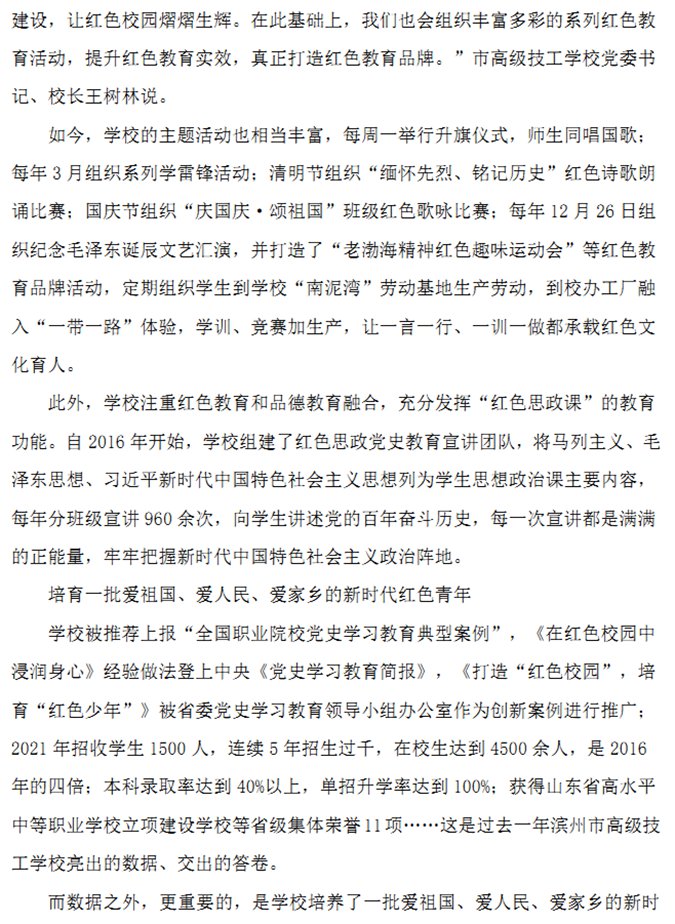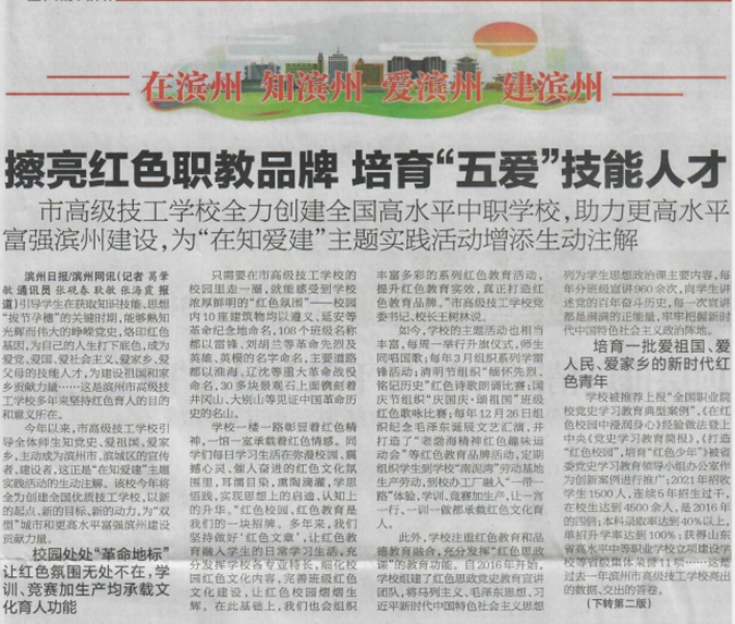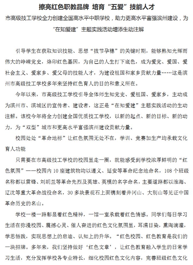 滨州市高级技工学校红色办学经验又登《滨州日报》头版头条