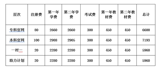 收费说明:各专业均按学分收取学费,经山东省物价局备案。开放教育专科按照学分收费,70 元/学分,最低毕业总学分 76 学分(70*76=5320)。本科 83 元/学分,最低毕业总学分 71 学分(83*71=5893)。考生费每生每科次 20 元,教材费按实际书价收取。