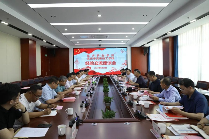 参观结束后,全体人员在北平楼八楼会议室座谈。孟维赞代表学校对临沂职业学院各位领导的到来表示欢迎,从突出红色办学、突出从严治校、突出红色教学、突出产教融合几个方面介绍了滨州市高级技工学校办学情况及发展成效。
