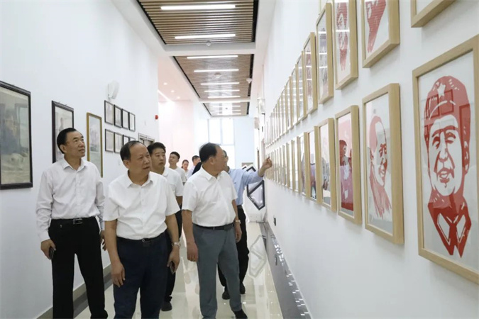 赖义金一行参观了东方红广场、嘉兴楼实训中心、韶山楼班级红色文化;穿过红色连廊,到井冈山楼现场参观了校企合作项目“数字工坊”和京东直播实训室;到北平楼参观了伟人塑像厅、红色藏品展厅、党史馆等红色展厅以及家校社三方共育报告厅。