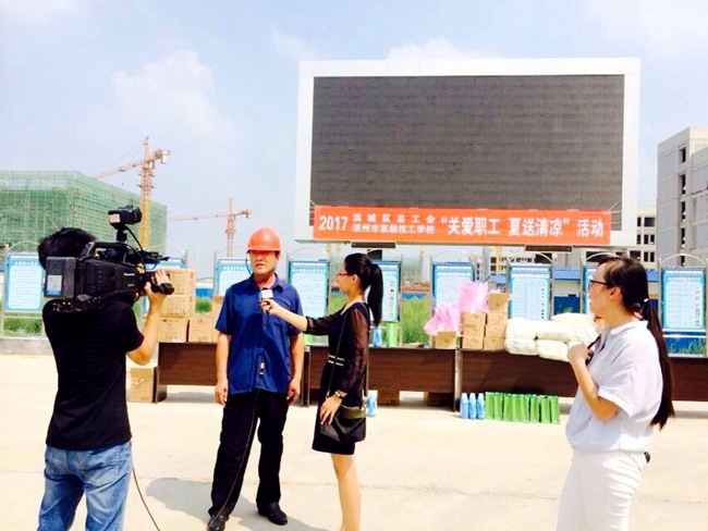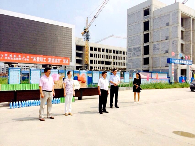 8月4日上午,在滨州市高级技工学校新校区建筑工地现场,滨城区总工会、滨州市高级技工学校机关工会在这里举行了“关爱职工、夏送清凉”活动。滨城区总工会主席荆开科,副主席刘新民,党委副书记、校长王树林,党委副书记史文莲到场并讲话,和工作人员一起将准备的毛巾、茶叶、香皂等防暑降温日用品发放到建筑工人手中,叮嘱大家合理安排工作、生活、饮食,为在酷暑中坚守工作岗位、辛勤付出的一线建筑工人送上一份清凉,捎去一份问候。