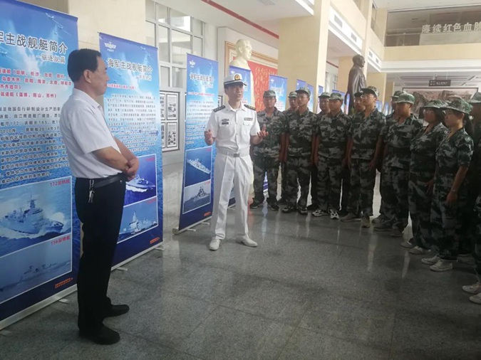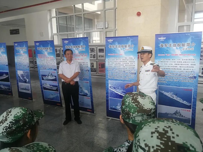 随后,同学们来到北平楼一楼大厅,参观三军高精尖装备挂图,叶莹磊政委亲自为大家讲解。同学们兴致勃勃地驻足参观,先进的武器装备让他们倍感自豪。接着同学们参观了学校国防教育展馆,直观的了解国防知识,感受科技强国,激发爱国情怀。