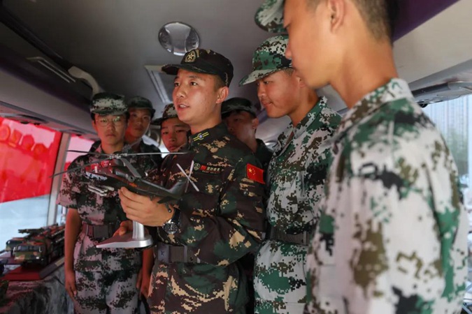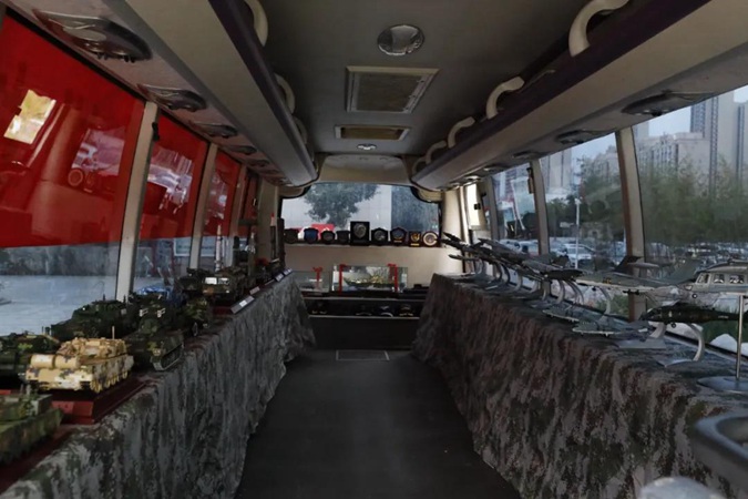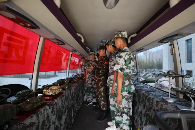 首先,同学们走进国防教育大篷车,参观武器模型,讲解员现场向同学们解说各类武器的构造和性能,让同学们近距离了解军事动态,感受国之重器。