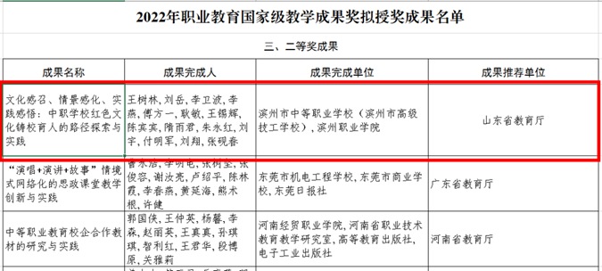 滨州市中等职业学校(滨州市高级技工学校)教学成果《文化感召、情景感化、实践感悟:中职学校红色文化铸校育人的路径探索与实践》获得2022年职业教育国家级教学成果奖二等奖。