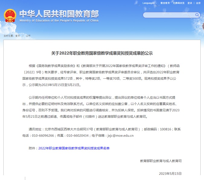5月15日,2022年职业教育国家级教学成果奖拟授奖成果公示。根据《国务院教学成果奖励条例》和《教育部关于开展2022年国家级教学成果奖评审工作的通知》(教师函〔2022〕9号)有关要求,经专家评审、职业教育国家级教学成果奖评审委员会审议,共评选出2022年职业教育国家级教学成果奖拟授奖成果572项。