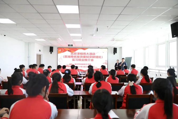 5月28日上午10:00,北京泽相苑大酒店(原湖南省发改委驻京联络处)人事部经理吴超强、邹凤到滨州市高级技工学校举行实习就业推介会。