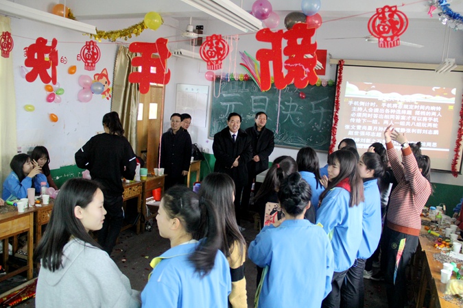 12月29日上午,滨州市高级技工学校组织了“庆元旦”班级联欢活动。本次联欢活动以班级为单位组织,活动主题为“学习十九大,展望2018”。师生们用彩带、气球等把教室装扮一新,每个教室里都洋溢着浓浓的节日氛围,到处欢歌笑语,喜气洋洋。学校校长王树林、副校长刘仲凯和相关科室负责人到各班教室,为师生们带去了学校领导真诚的节日祝福。
