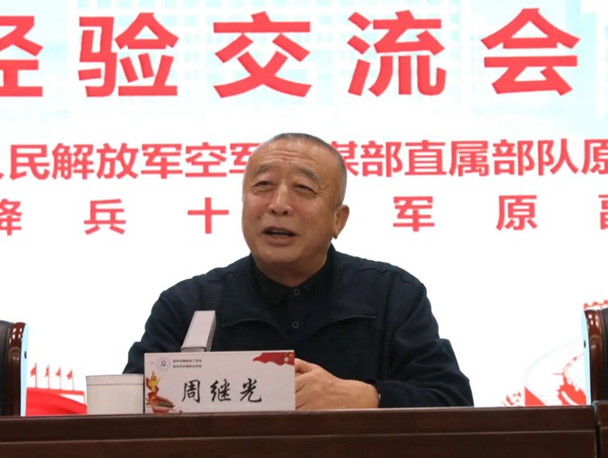 中国人民解放军空军参谋部直属部队原党委副书记、空降兵十五军原副军长周继光将军讲话,结合自身经历讲述立德树人、红色育人的重要性。