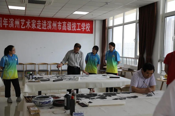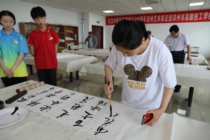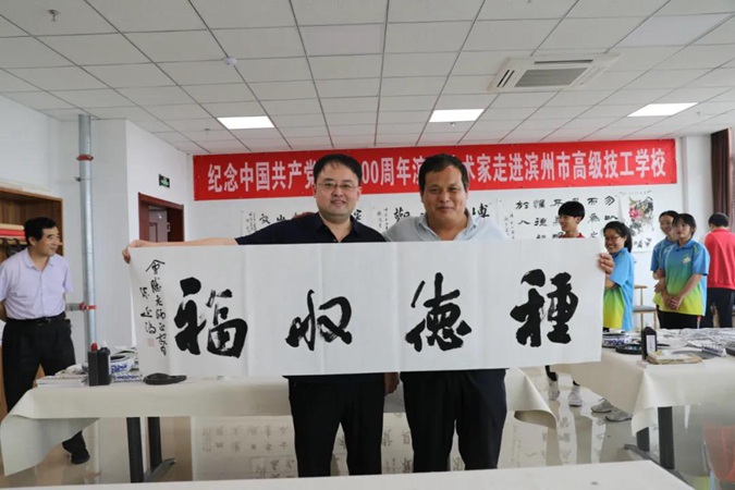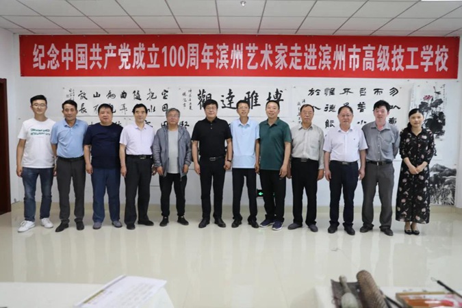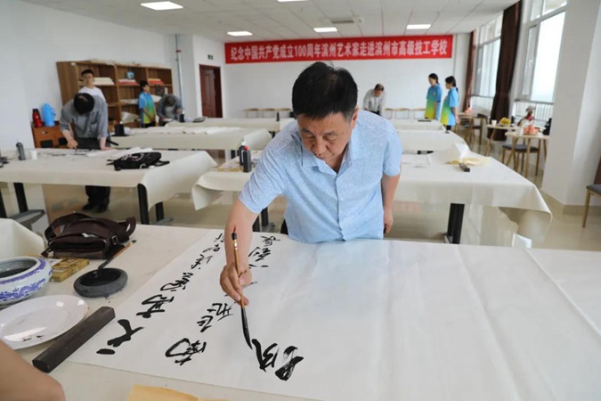 为庆祝中国共产党成立100周年,6月2日,滨州市文联、滨州市书法家协会、滨州市美术家协会的艺术家们走进滨州市高级技工学校,现场创作,点赞红色校园。