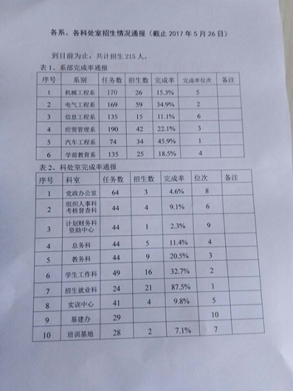 5月27日系部召开大会,辛立胜副主任主持,王世福主任讲话,公布截止5月27日,汽车工程系共招生34人,完成率为45.9%,暂列第一。肯定了前期成绩,下一步任务依然艰巨,要严格贯彻刘仲凯校长的四项要求,再接再厉,再创辉煌。