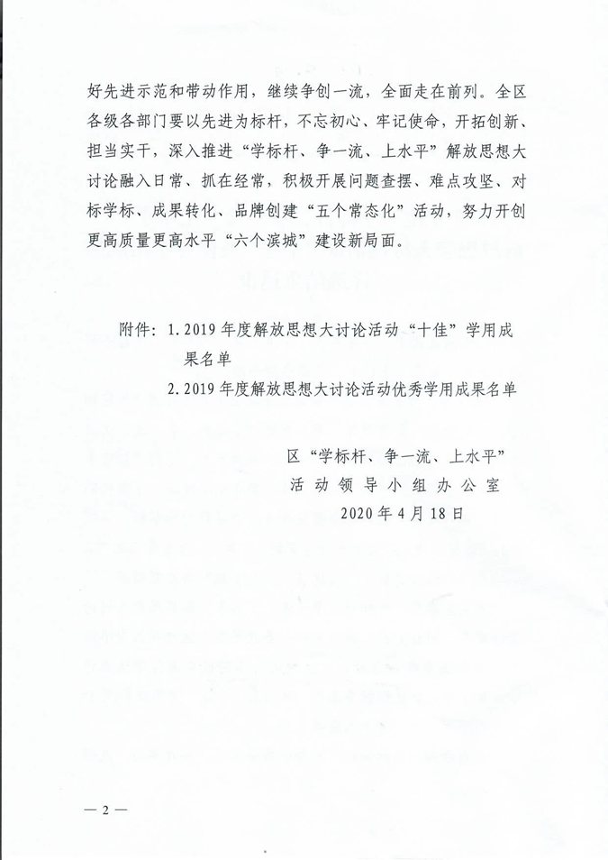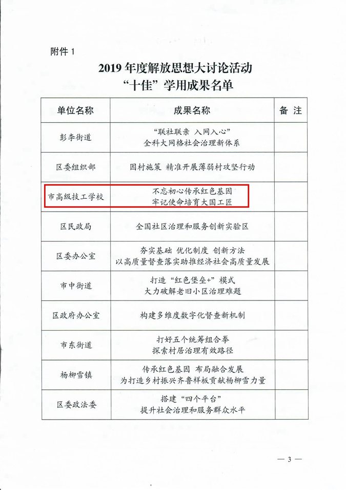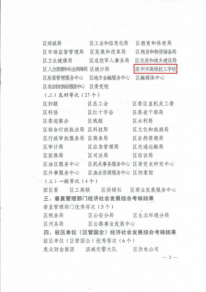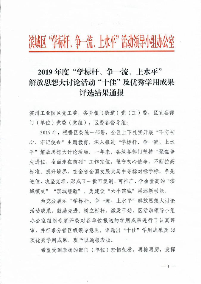 4月18日上午,全区“重点工作攻坚年”暨招商引资工作推进动员大会召开,大会宣读了《关于2019年度滨城区经济社会发展综合考核结果的通报》,印发了《2019年度“学标杆、争一流、上水平”解放思想大讨论活动“十佳“及优秀学用成果评选结果通报》。滨州市高级技工学校荣获多个奖项。