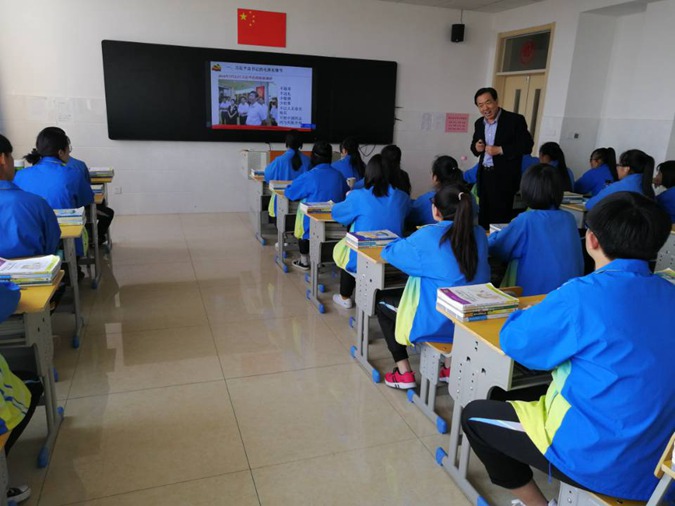 课堂上,王校长以习近平总书记任职足迹为主线,用朴实的故事,生动的语言,带给学生们一堂精彩的“红色基因”思想政治教育课。王校长就我校打造的“红色文化育人”理念,结合学校特色的建筑设计,道路、楼宇命名等的深刻内涵,与学生们进行了亲切的交流互动。
