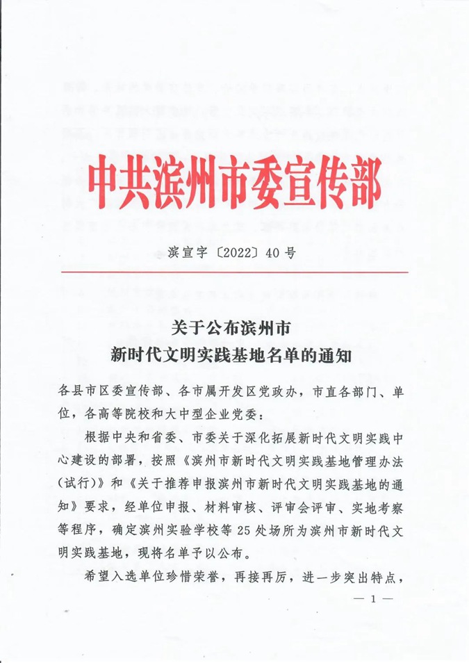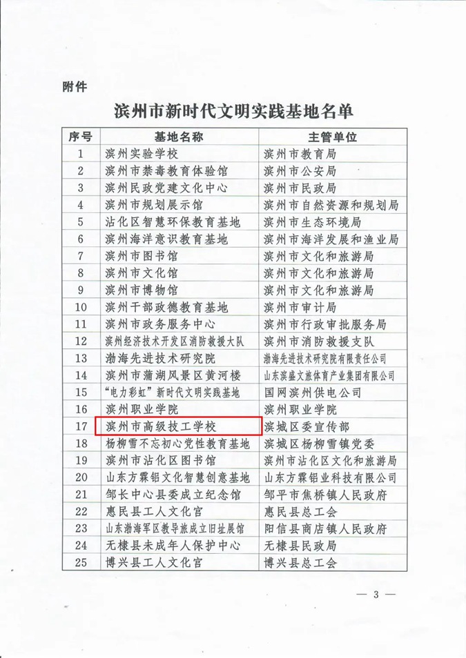 近日,中共滨州市委宣传部印发《关于公布滨州市新时代文明实践基地名单的通知》,滨州市高级技工学校被评为滨州市新时代文明实践基地。