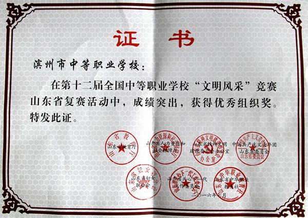 近日,由教育部、人力资源社会保障部、中央文明办、共青团中央、全国妇联、中国关工委、中华职业教育社组织举办的第十二届全国中等职业学校“文明风采”竞赛活动各类获奖证书下发到学校。此次竞赛分为征文演讲类、职业规划类、摄影视频类、校园情景剧类、微视频类、才艺展示类等六大类别。对于此次竞赛,我校高度重视,认真组织,全校师生精心准备,积极参与,在全校真正形成了“系系都组织、班班搞竞赛、人人都参与”的竞赛局面。我校选拔63件作品参加滨州市选拔赛,其中20件作品被推荐代表滨州市参加山东省复赛,获得一等奖1个、二等奖6个、三等奖8个、优秀奖5个,省赛获奖率达到100%,学校荣获山东省复赛优秀组织奖。经过山东省复赛组委会选拔,有7 件作品代表山东省参加全国决赛,获得三等奖2个、优秀奖5个,国赛获奖率达到100%,我校获得本次竞赛全国决赛学校优秀组织奖,成绩斐然,为学校争得了荣誉,充分展现了我校师生的积极进取、勇争一流的良好精神风貌和文明风采。