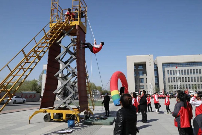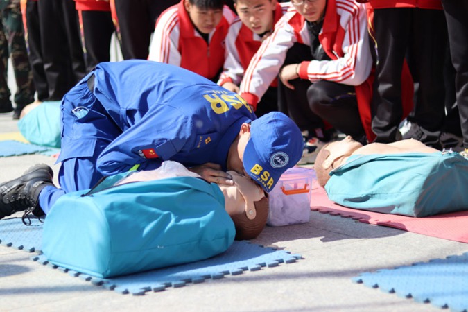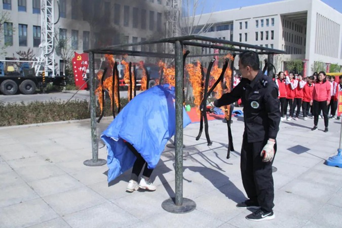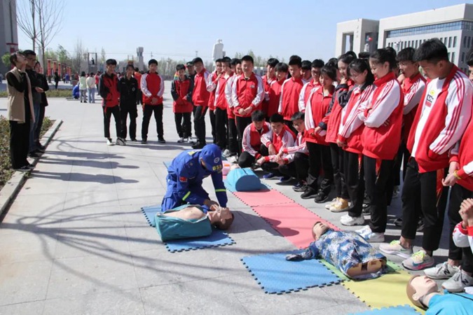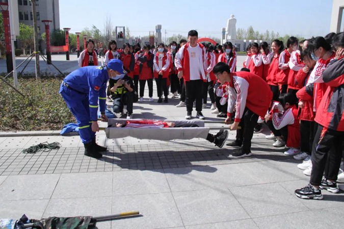 应急疏散演练结束后,全体学生利用4月14日、4月15日两天时间进行了体验式安全教育。在滨州市安全教育学校教官的带领下,分别进行了楼房下滑逃生、火海逃生、烟雾逃生、心肺复苏、简易担架的制作与伤员搬运、伤员包扎(紧急救护)、地震避险等安全项目的体验。