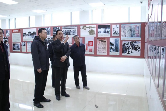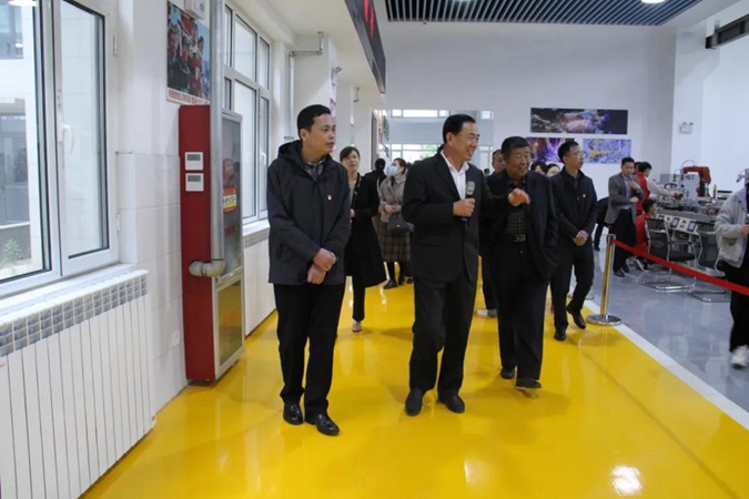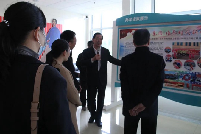 来访人员参观了嘉兴楼实训中心、韶山楼红色育人展厅、“南泥湾”劳动基地、井冈山楼产教工坊、北平楼红色展品展馆和红色图书馆等。王树林介绍了学校红色办学特色和党史教育基地建设情况,大家边看边听,在红色校园内重走一遍红色纪念地之路,重温红色革命历程,接受党史教育。