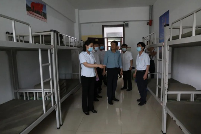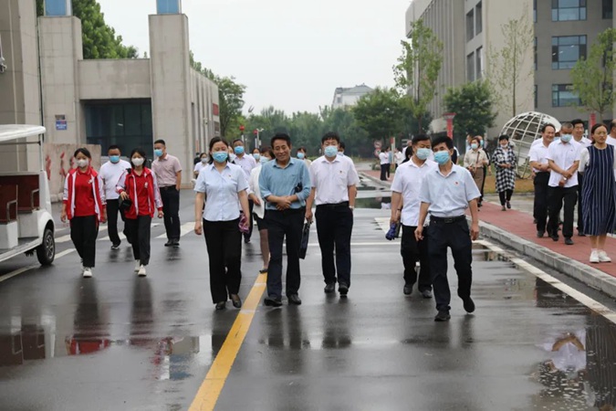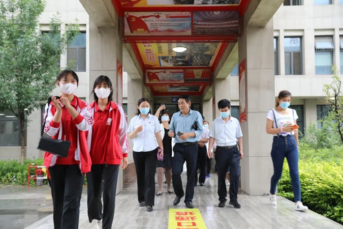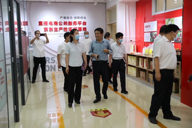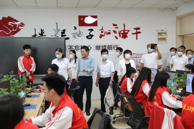 王青一行从东方红广场到嘉兴楼、韶山楼、井冈山楼、遵义楼、古田楼,参观了实训中心、产教工坊、京东直播实训室、红色连廊、南泥湾师生劳动基地、学生宿舍,到北平楼参观了红色藏品展馆、伟人塑像厅、图书馆、党史教育展馆。