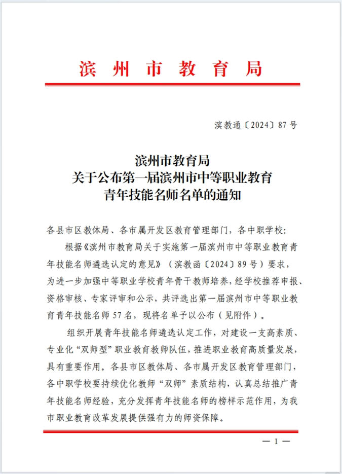 近日,滨州市教育局公布2024年第一届滨州市中等职业教育青年技能名师名单,滨州市中等职业学校(滨州市高级技工学校)陈宾宾、刘翔、王锡辉、吴海梅、吴倩5名教师获此殊荣。