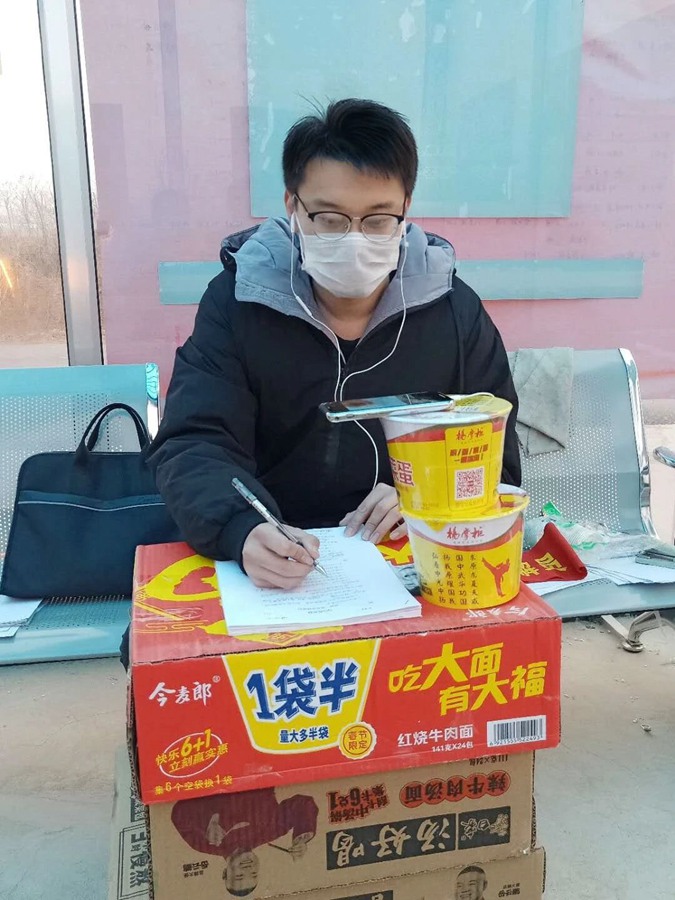 在村值守期间,他不忘为学生上课,利用泡面箱搭建讲台,在防疫站点、村委办公室,给学生创建了一个又一个流动云课堂。