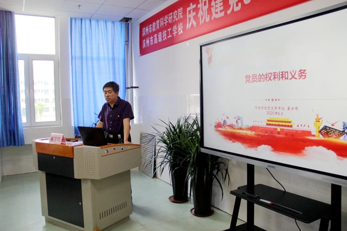 在滨州市教育科学研究院与滨州市高级技工学校联合举办庆祝建党99周年主题党日活动中,滨州市高级技工学校党委书记、校长王树林和滨州市教育科学研究院党支部书记崔方锋分别为参加活动的党员同志讲授了题为《不忘初心,继续前行》、《党员的义务和权利》的党课。