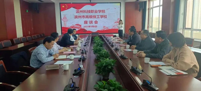 参观结束后,双方领导在北平楼八楼会议室召开座谈会。王树林介绍了学校红色育人先进经验,刘岳介绍了学校基本情况。王家爱表示,滨州市高级技工学校的红色教育已经成为全国的一个样板,学生在红色氛围的教育熏陶下,素质有了明显提升,颠覆了人们对原有技工教育的印象,红色育人经验值得推广借鉴;希望双方加强合作,互联互鉴,共同服务我市经济发展。