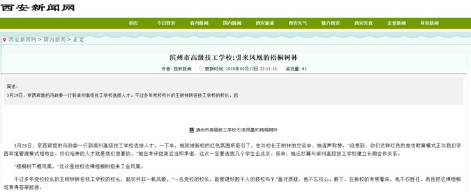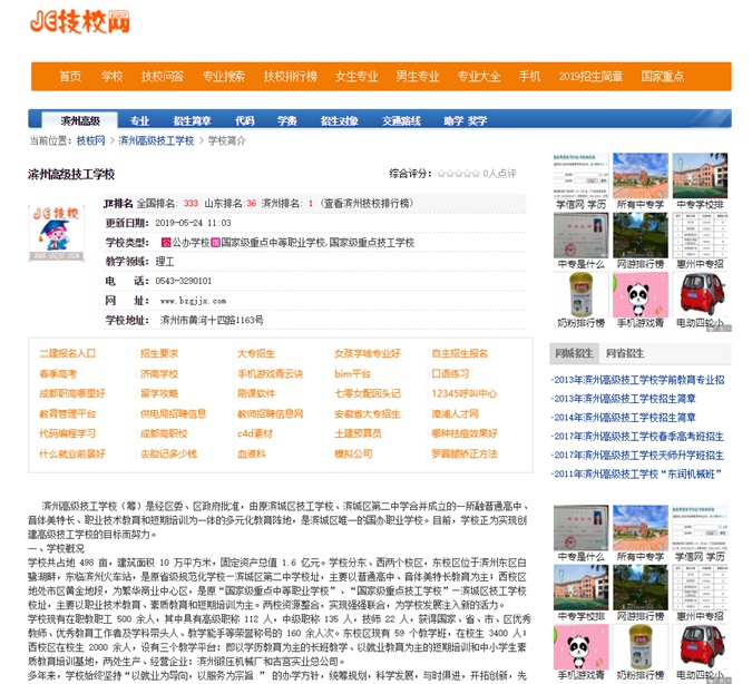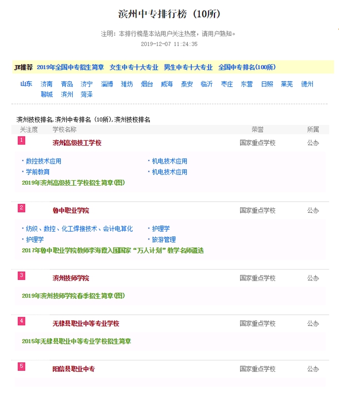 该网站刊登了截止2019年底全国16043家技校(中等职业学校)人气指数、社会关注度、活跃度、影响力大排名。我们滨州市高级技工学校(滨州市中等职业学校)排在滨州市第一名(鲁中职业学院排第二,滨州技师学院排第三,无棣县职业中等专业学校排第四,阳信职业中专排第五,滨州技术学院排第八)。我校排山东省第36位,排全国第333位。