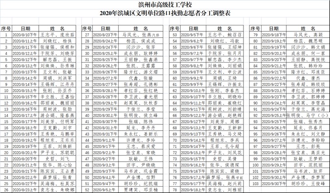 按照市创城办工作安排,自8月10日起城区文明交通劝导志愿服务活动每岗由1人劝导改为2人劝导,统一增加新劝导旗帜。根据上级要求,经校领导研究,现将《滨州市高级技工学校2020年滨城区文明单位路口执勤志愿者分工表》做出调整,在原先分工的基础上,将未参加交通劝导志愿服务的组长、副组长添加到志愿服务组。