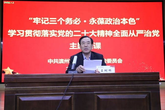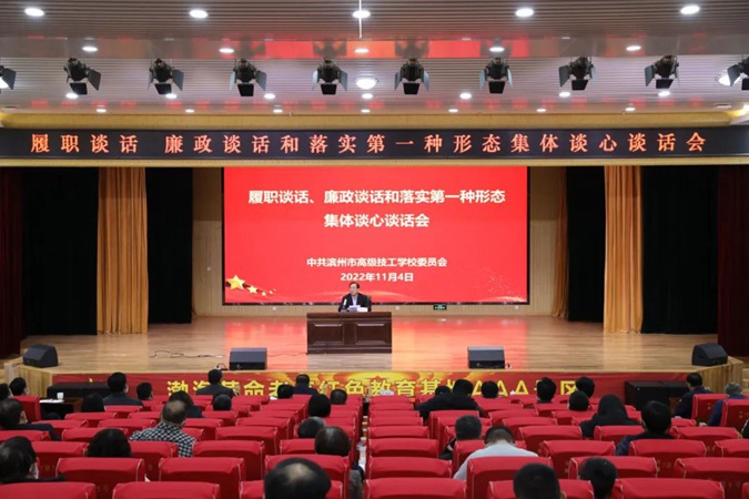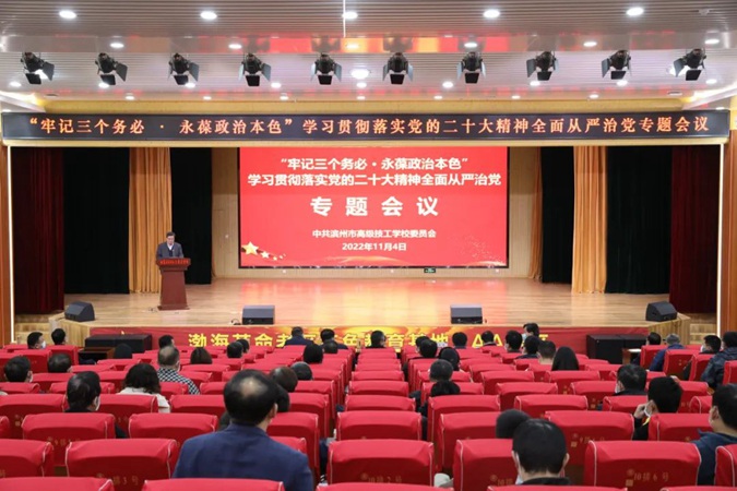 为认真学习贯彻党的二十大精神,深入推进全面从严治党、从严治校工作,在全校迅速掀起学习贯彻落实党的二十大精神热潮,11月4日下午,滨州市高级技工学校(滨州市中等职业学校)在北平楼报告厅召开了“牢记三个务必,永葆政治本色”学习贯彻落实党的二十大精神全面从严治党专题会议。党委书记、校长王树林,党委副书记、副校长孟维赞,党委委员、副校长刘岳,党委委员、纪委书记、市纪委监委派驻监察专员宋志刚及全体在职党员、中层以上干部参加会议,宋志刚主持。