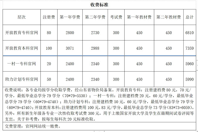 4. 报名时需缴纳第一学年费用(注册费、考试费、学费),本科4071元、专科3780元、一村一3320元、助力计划3350元(收费情况见上面收费明细)。缴费方式为国家开放大学网上在线支付(支付宝、微信均可)。
