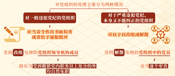 根据《中国共产党纪律处分条例》规定,对党组织的处理主要分为两种情况:对一般违犯党纪的党组织,上级党组织应当责令其作出书面检查或者给予通报批评;对于严重违犯党纪、本身又不能纠正的党组织,上一级党的委员会在查明核实后,根据情节的严重程度,可以予以改组或解散。