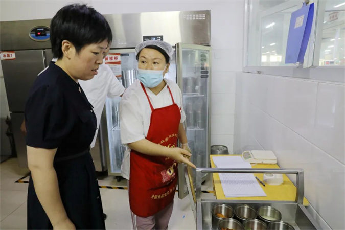 在学校食堂,袁俊英听取了负责人对食品安全日常管理工作开展情况的汇报,对食堂就餐区、操作间、食品库房等进行了全面检查。现场查看食堂卫生清洁情况,检验“三防”设施配备和整体环境卫生控制水平,排查食品储存、留样等情况。