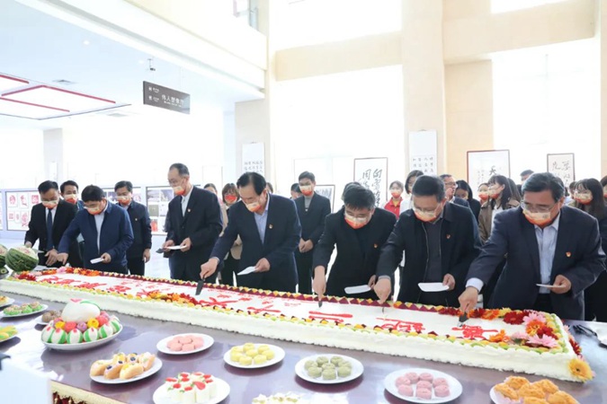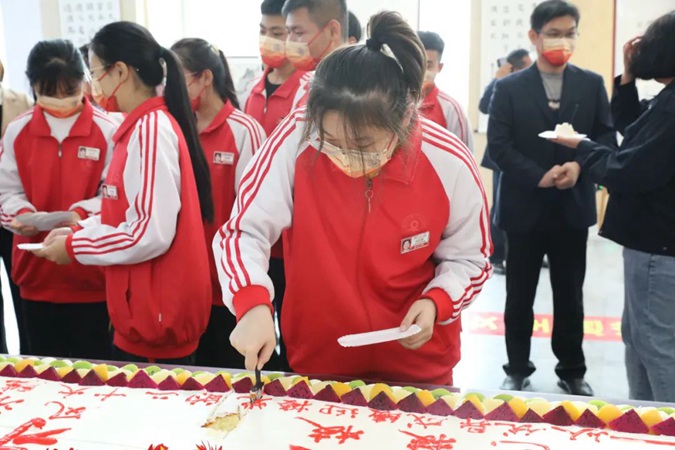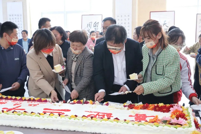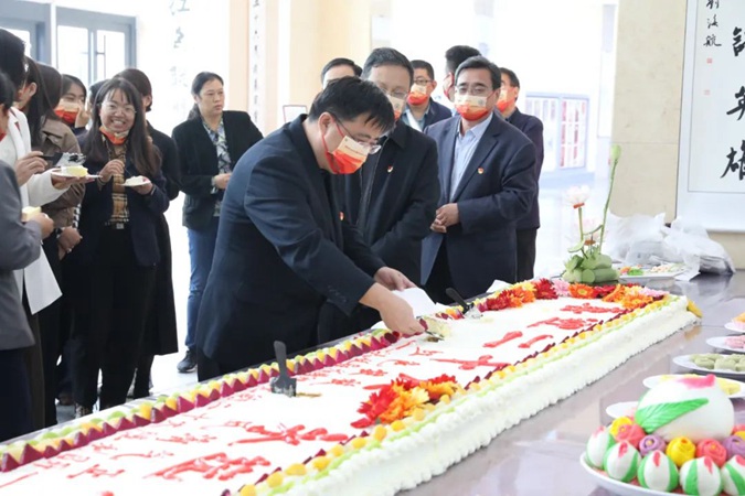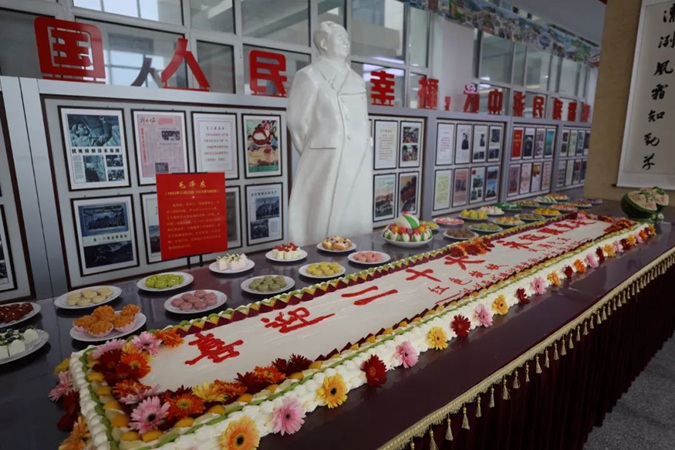 为喜迎党的二十大,学校烹饪班师生共同制作了巨型蛋糕、食品雕刻、各式甜品等。
