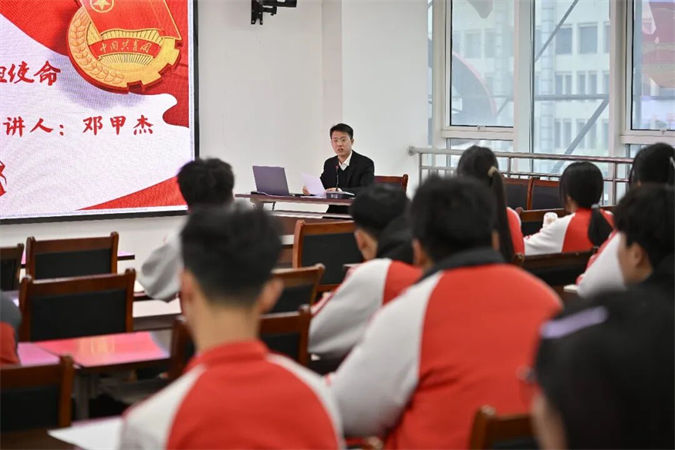 青年教师邓甲杰结合亲身经历和真实案例,为全体学员授课。他生动阐释了坚守信仰、扛起责任、锤炼作风的重要意义,引导学生干部树立正确的角色认知,坚持以服务同学为根本,脚踏实地、务实肯干,以青春之我、奋斗之我,勇担时代使命,努力成长为信念坚定、作风过硬、堪当重任的青年骨干。